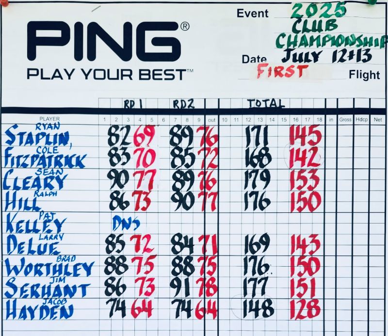 In the First Division, Jake Hayden had rounds of 74 each day for a 148 total. Winning low net in the First Division was Cole Fitzpatrick.