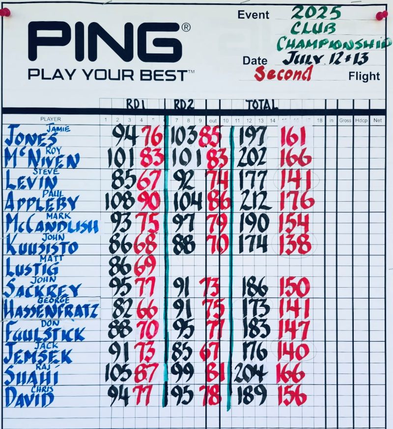 In the Second Division, George Hassenfratz had rounds of 82-91=173 nudging out low net winner John Kuusisto by 1 stroke. Jack Jemsek won 2nd low net and Steve Levin finished in third.