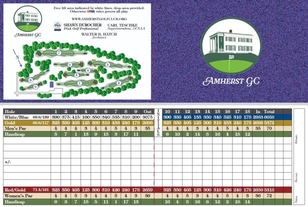 Established in 1900, the semi-private Amherst Golf Club is owned by Amherst College and run independently by an incorporated community group of dedicated golfers. Located on Route 116, the historic course is a short distance from both the College and the Amherst Town Common. The beautifully maintained 9-hole layout, which tests all skill levels, was designed by Walter Hatch, an assistant of the famed Donald Ross, and later renovated by Geoffrey Cornish. Measuring 3,075 yards from the back tees and 2,983 yards from the forward tees, with holes ranging from 160 to 535 yards, the par-35 course includes multiple tees, elevated tees and greens, many strategic green-side bunkers, and greens that are famous for being fast and true. The Clubhouse offers a well-stocked pro shop, snack bar, and friendly staff under the direction of PGA Professional, Shawn Durocher. Shawn and her husband Pro Rick Durocher are both available for private lessons.