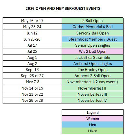 The 2026 Tournament and Event schedule is provided below. See also the Amherst Golf Club Weekly Schedule.